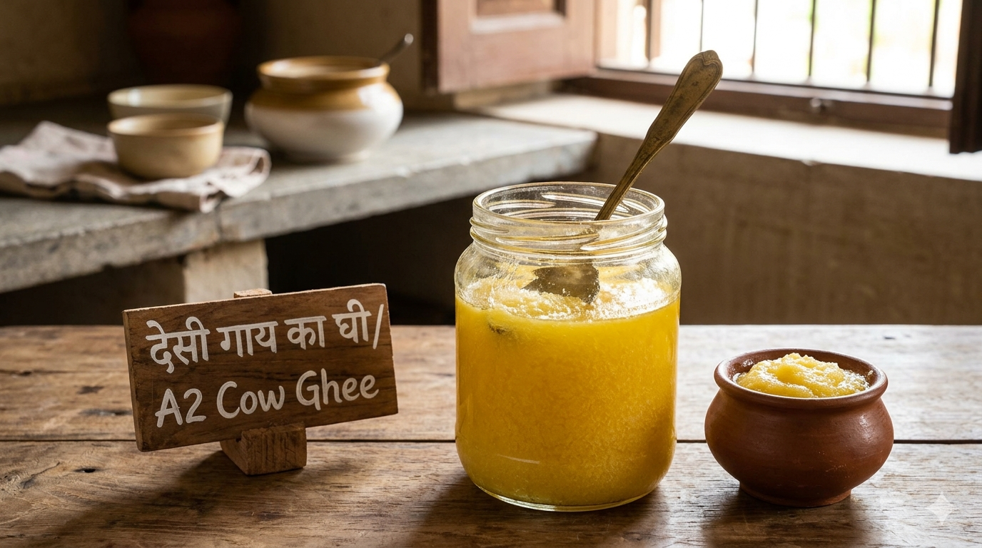 शुद्ध A2 देसी गाय का घी, पारंपरिक बिलोना विधि से। सुनहरा, सुगंधित और 100% शुद्ध। आयुर्वेद का अमृत।