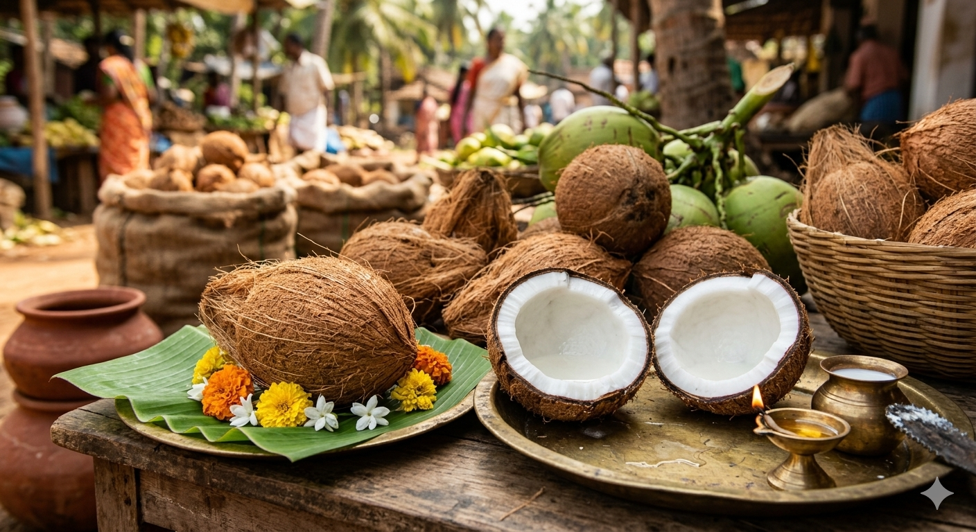 ताजा देसी नारियल, प्राकृतिक खेती से। बहुपयोगी — तेल, दूध, खाना।